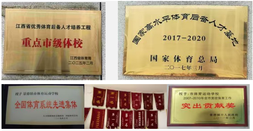 学校自2005年至2024年连续20年五个奥运周期被国家体育总局命名为“国家高水平体育后备人才基地”,并先后5次被国家体育总局、教育部授予“全国体校先进单位”,连续五届省运会被景德镇市人民政府授予出席省运会优秀集体奖,出席省运会突出贡献奖训练单位。2025年被江西省体育局授予省优秀体育后备人才培养工程“重点市级体校”