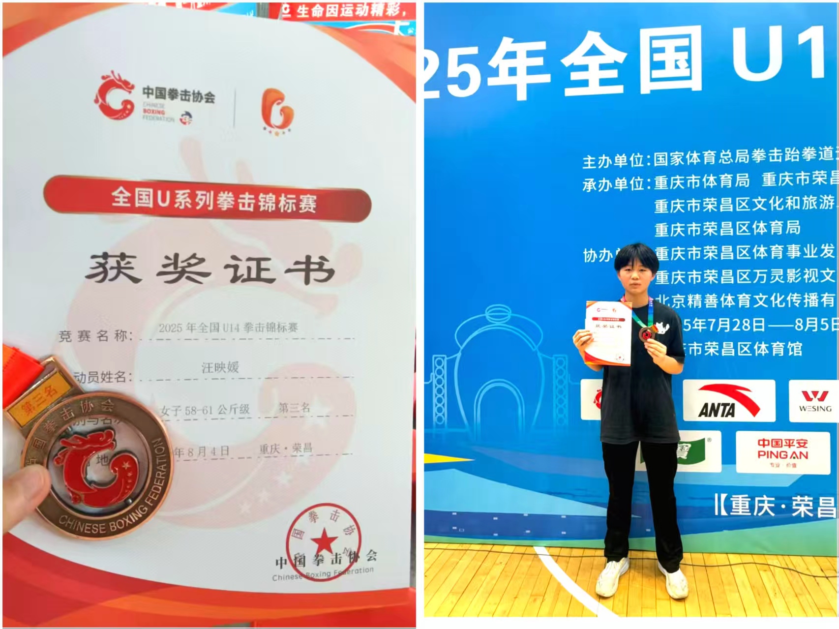 8月4日,从 2025 年全国 U14 拳击锦标赛赛场传来喜讯,景德镇市体校运动员汪映媛在 58-61Kg 级别比赛中表现出色,斩获铜牌。